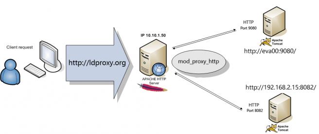 The load balancer nodes are two LogicalDOC servers that are accessed by IP and by hostname (eva00), of course the Apache server must be able to resolve the hostname.