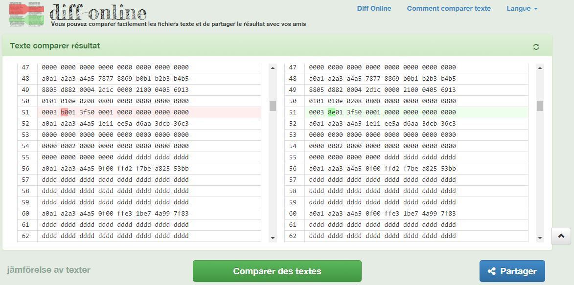 Ensuite ouvrez les fichiers avec un éditeur de texte qui gère l’hexadécimal comme « Sublim Text », et comparez les différences entre ces deux fichiers, pour cela je vous conseil de copier le contenu des fichiers sur ce site :
