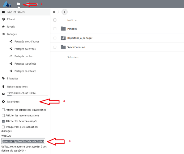 - Connectez-vous à Nextcloud et récupérez l’adresse d’accès WebDAV. Pour ce faire, cliquez sur Fichiers, puis Paramètres en bas à gauche, et enfin copiez-collez l’adresse donnée dans le champ.