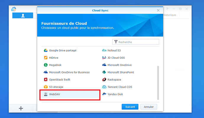 - Sélectionnez WebDAV dans la liste des fournisseurs proposée