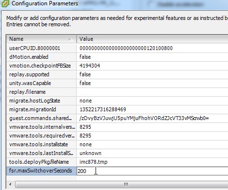 Get-VM Votre_VM | Get-View |?{-not $_.Config.Template}|%{$_.ReconfigVM((New-Object VMware.Vim.VirtualMachineConfigSpec -Property @{extraconfig=@((New-Object VMware.Vim.optionvalue -Property @{Key=”vmotion.maxSwitchoverSeconds”;Value=”200″});(New-Object VMware.Vim.optionvalue -Property @{Key=”fsr.maxSwitchoverSeconds”;Value=”200″}))}))}